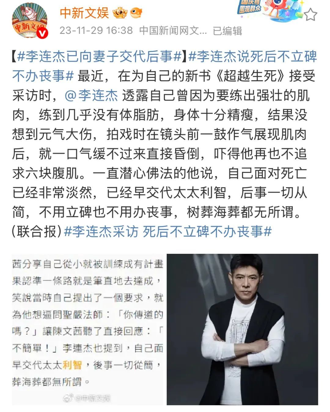 據(jù)中新娛樂報說念,2023年11月,李連杰在為我方的新書《非凡死活:李連杰尋找李連杰》采納采訪時示意,我方早已向愛妻布置事后事。